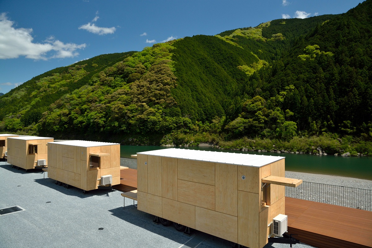 名付けて「住箱(じゅうばこ)」。“仁淀ブルー”で知られる仁淀川沿いの高台に、まさに箱型のコテージが並んでいます。アウトドアブランドで知られる「スノーピーク」のモバイルハウスとして、350万円(税別)で販売され、実は誰でも購入することができます。