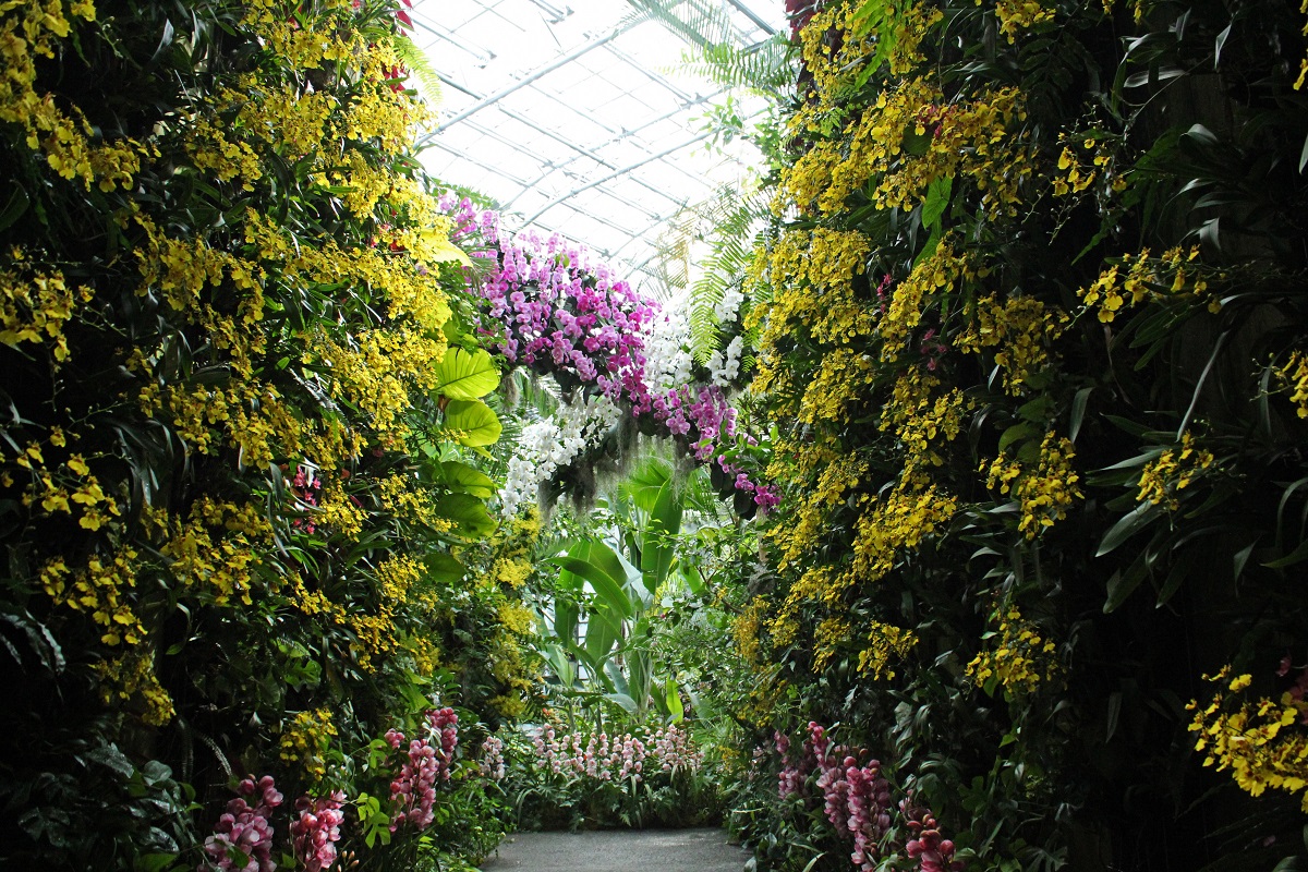 牧野植物園で人気の温室では、2019年2月1日から、「ラン展 百花繚蘭〜美しきランの世界〜」がスタート。ランは約25,000種にもおよぶといい、その中でも人気が高いカトレア、シンビジウム、デンドロビウム、ファレノプシス、パフィオペディルムの5属から代表的なランが一挙展示されています。
