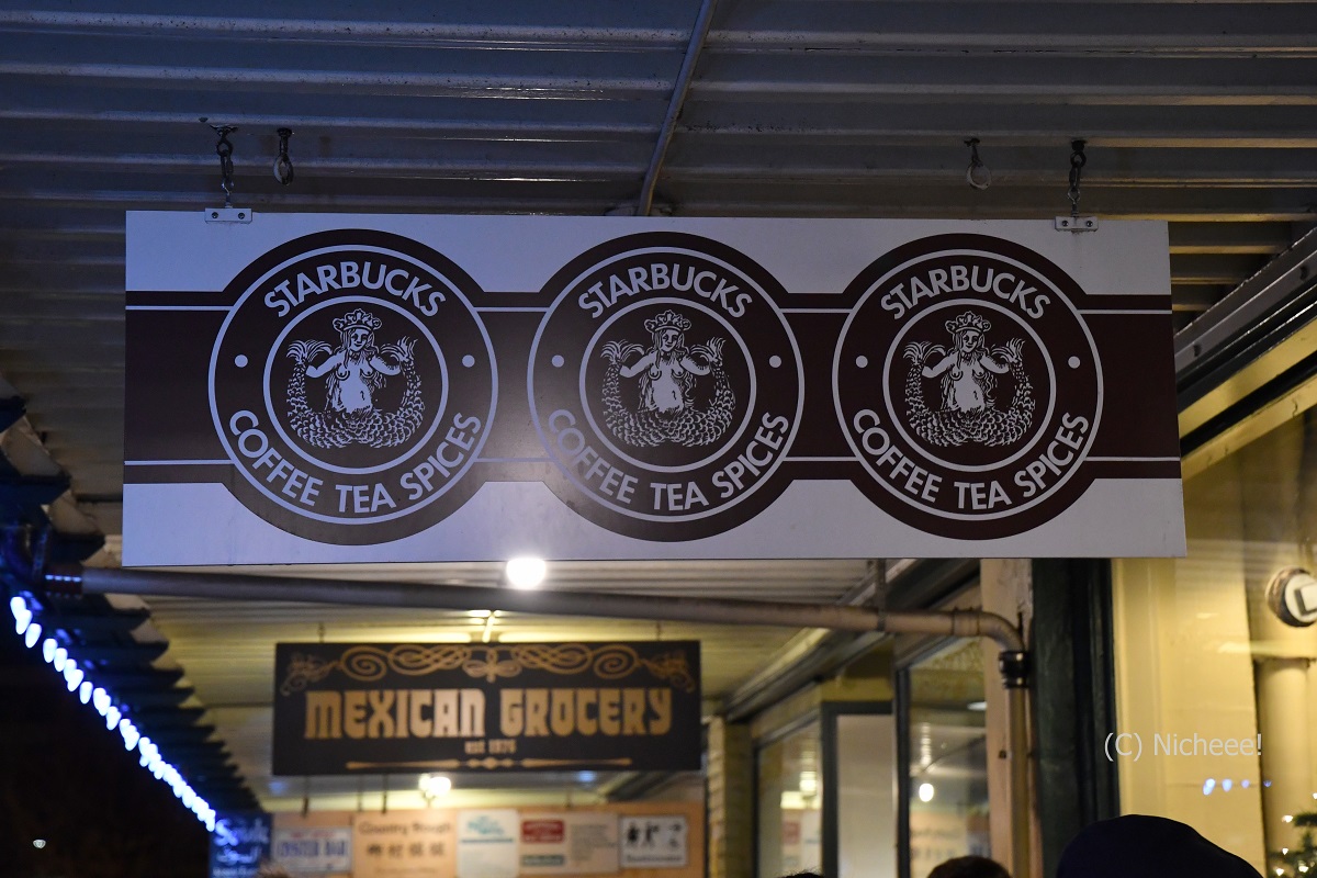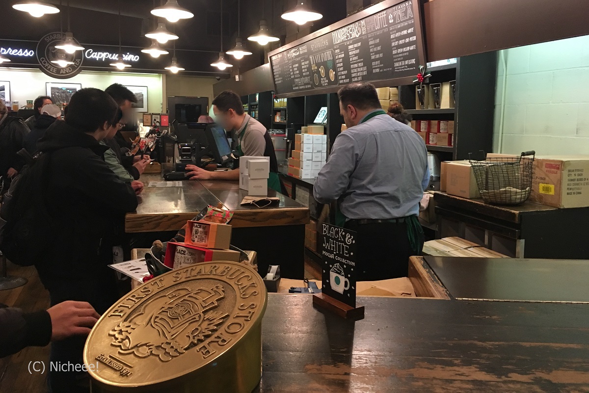 その1号店、もしも行列なしで入るには、朝8時過ぎには行かないといけません。朝6時から営業しています。そして、日中から夜にかけてはずっと長蛇の列で、店の中に入るだけで少なくとも1時間ほどかかりました。通常の店舗とは違うスターバックスの「ロゴ」、1号店の記念プレートは店内にあるので、これはぜひともお見逃しなく。