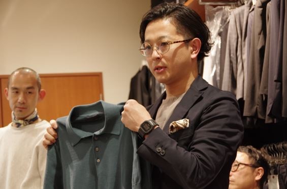シャツのように台襟をキチンと作ってあるのだ。襟の部分と台襟の部分で編地を変えることで、襟が成立する作りになっている。これで襟がきちんと立つ。2018年の夏にヒットした商品の改良バージョンだ。