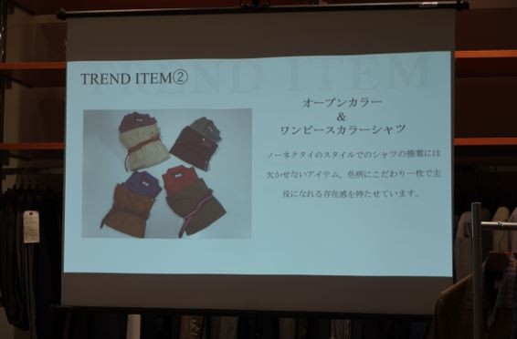 スーツとの組み合わせも、洋服を楽しむように着ることができる。ユニフォームではなく、ドレスアップできるように。従来の青山にはない大人な表情を見せる物が多い。