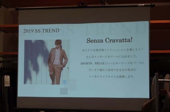 「Senza Cravatta!」という言葉自体は、10年から15年前に流行った業界的には死語である。だが、あえて使うことで、今でもビジカジスタイルとして残るピチッとして窮屈なイメージを、リラックスして楽しいイメージへと変える心意気。