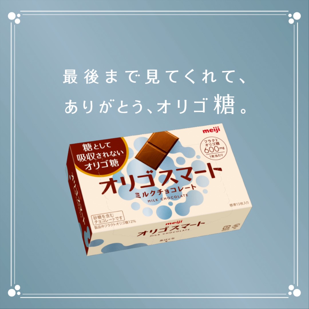 そして、新木優子が出演するCMはMeiji「オリゴスマートミルクチョコレート」は、“フラクトオリゴ糖” (※1)という、糖質の吸収が穏やかになる成分が含まれているため、チョコレートを食べるのを我慢しなくてよい、まさに「ありがとう、(フラクト)オリゴ糖」な商品なのだ。