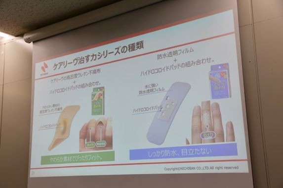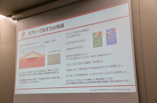 絆創膏やセロテープなど、暮らしの中の粘着テープでおなじみのニチバンは、モイストヒーリング(湿潤療法)を取り入れた「ケアリーヴ 治す力」シリーズから「ケアリーヴ 治す力 防水タイプ」の新サイズを3月5日より発売する。それに伴い、進化し続けるケアリーヴシリーズの商品理解促進のため、メディア向け製品体験セミナーを2月25日、同社で開催した。