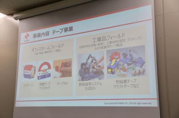テープ事業では文具や雑貨などを扱う「オフィスホームフィールド」と包装材料などを扱う「工業品フィールド」を展開。同社が初めて考案した葉野菜を束ねる紫色のテープ「たばねら」は現在でも圧倒的なシェアを誇る。
