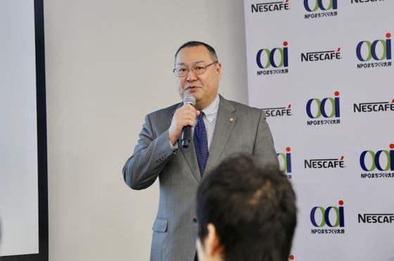 ȯɽ²ñ¤ÎËÁƬ¤Ç¤Ï¡¢NPO¤Þ¤Á¤Å¤¯¤êÂç°æ Íý»öĹ¤Î¿À¸Í»°¸µ»á¤¬ÅÐÃÅ¡£¡Ö²æ¡¹¤¬¼è¤êÁȤó¤Ç¤¤¤ë¡È·ò¹¯¤Ê³¹¤Å¤¯¤ê¡É¤ä¡¢ÉÊÀÄ󾧤¹¤ë¡ÈÅÔ»Ô·¿´Ñ¸÷¡É¤Î¥³¥ó¥»¥×¥È¤Ë¿ç̲¥«¥Õ¥§¤¬¹çÃפ·¤Æ¤¤¤ë¤È´¶¤¸¡¢¥Í¥¹¥ì¤µ¤ó¤Ë¤ªÀ¼³Ý¤±¤µ¤»¤ÆÄº¤¤¤¿¡×¤ÈÏä·¤¿¡£