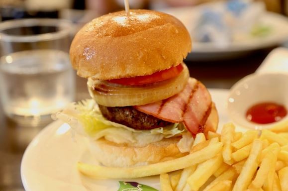 国産の牛肉を使ったパティは赤身がメイン。ボリューミーながらあっさりした味わい。トマトやオニオン、ベーコンと調和し食べ応え抜群だ。