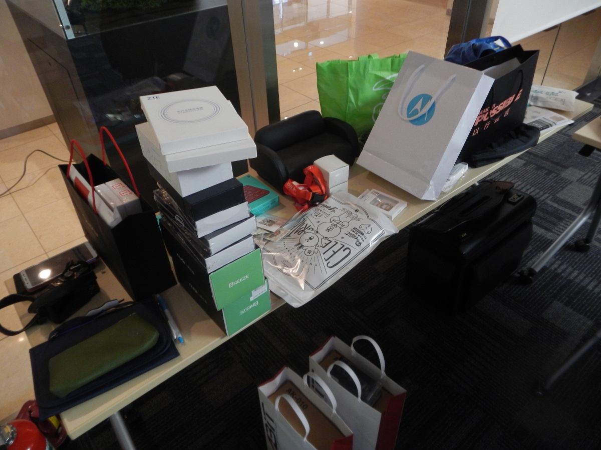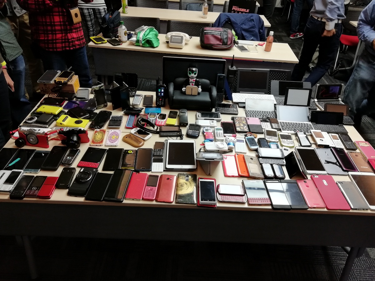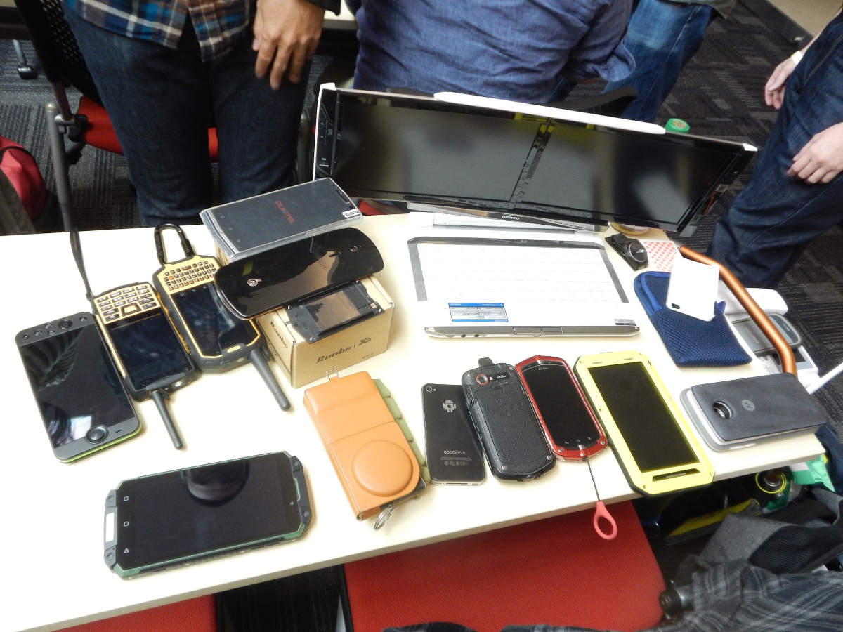 なお、会場では、着席後に持参した端末を机の上に並べている参加者も多い。八王子変態端末オフでは毎回恒例の光景である。