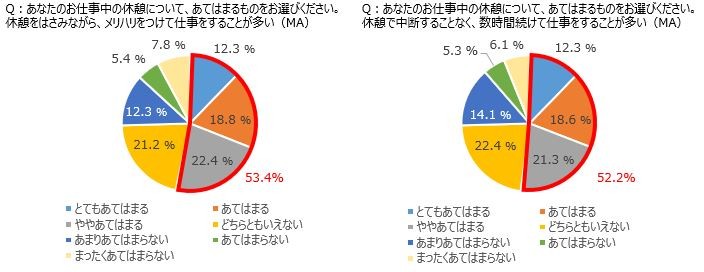 ◼仕事中の休憩に関しては、「休憩をはさみながら、メリハリをつけて仕事をすることが多い(53.4%)」、「休憩で中断することなく、数時間続けて仕事をすることが多い(52.2%)」と、いずれも過半数を超えており、2種類の働 き方が存在していることが明らかに。