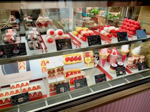 ショーケースにはイチゴを使った華やかなビジュアルのスイーツがディスプレイ。見ているだけでもワクワク気分も一層アップ!