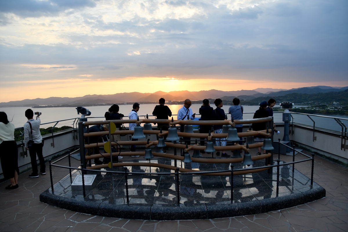 このロープウェイは通常は昼間のみの運行。特別に日没前に乗車して、空が夕焼けで美しく染まっていく様子をロープウェイから“空中散歩”で楽しみ、終点の大草山にある「恋人の聖地」に認定された屋上展望台では、360度のパノラマで絶景の夕景が堪能できます。展望台にあるカリオンの音色とともに、太陽が湖面にゆっくりと沈んでいく様子は、まさに絶景そのものです。
