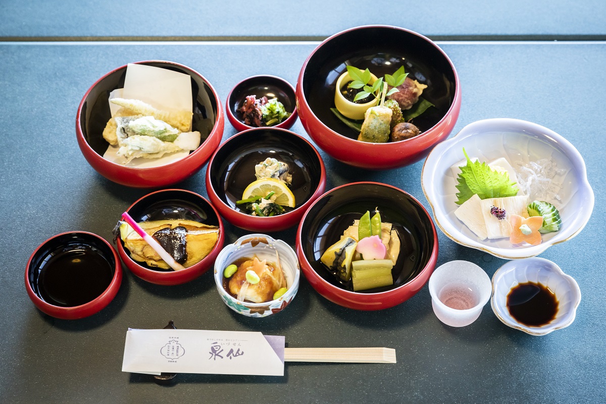 泉仙では、鉄鉢をかたどった木製で輪島朱塗りの器に、旬の食材をふんだんに使った天ぷらや炊き合わせ、煮物、揚げ物、豆腐、湯葉など四季折々の味覚を、精進料理として提供しています。肉や魚などがない料理であっても、1点1点の料理に味と「禅」のこだわりが感じられ、じっくり味わうと満足度の高い料理です。すべての料理が並んだ時の色どりも見事。※料理は時期によって変わります