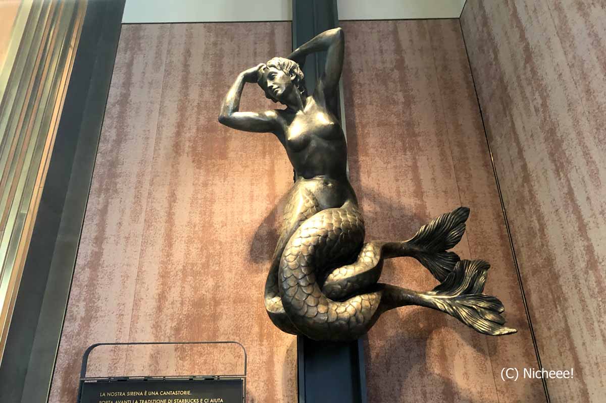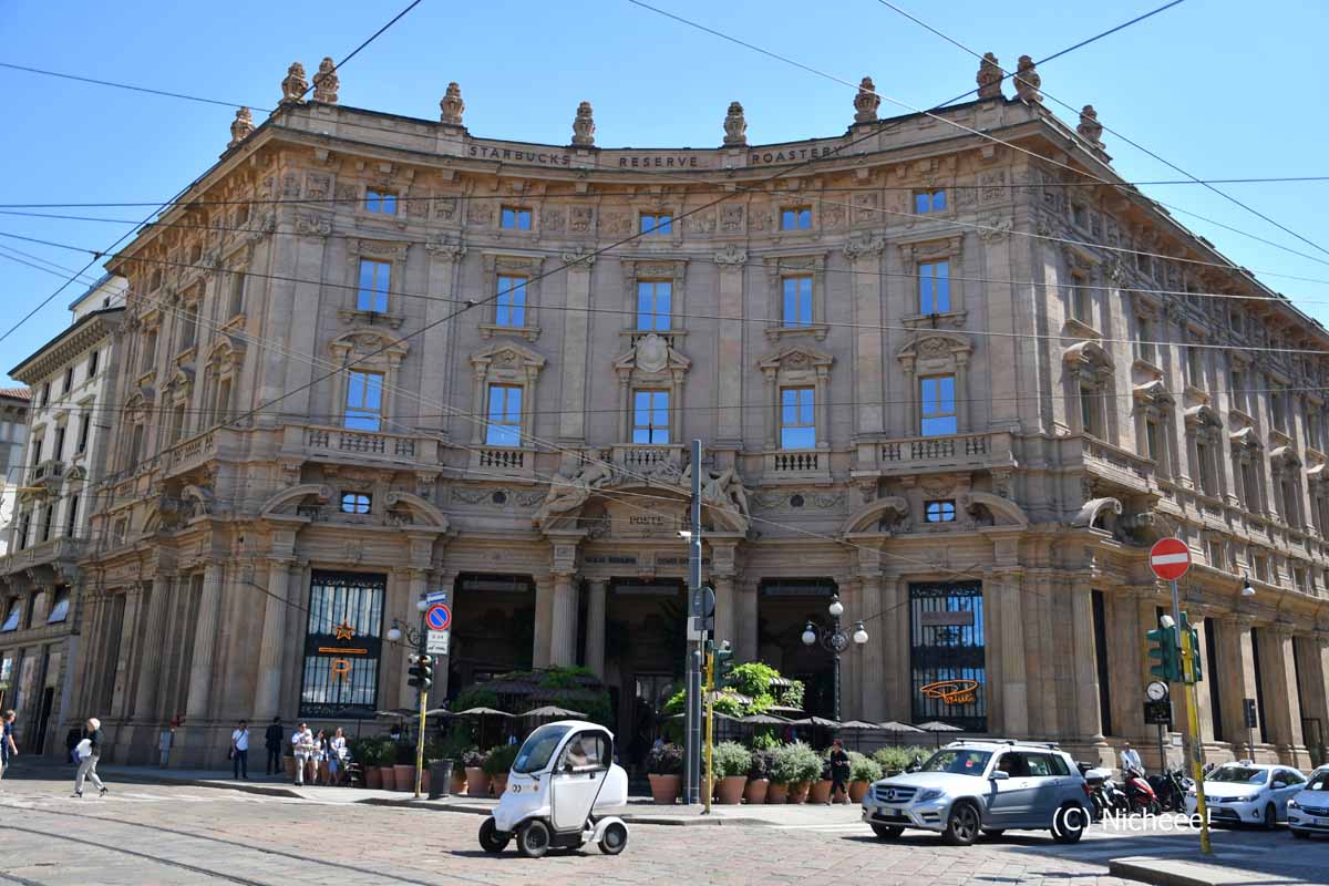 場所は、ミラノの中心部にあるドオーモにも近い、Piazza Cordusio(コルドゥーシオ広場)に面したところ。地下鉄の駅から徒歩圏内、目の前の道路を路面電車(トラム)も走っています。ここは20世紀初頭に建てられた旧郵便庁舎を店舗として改装されました。なお、外からはスターバックスのサイレンロゴは見えません。