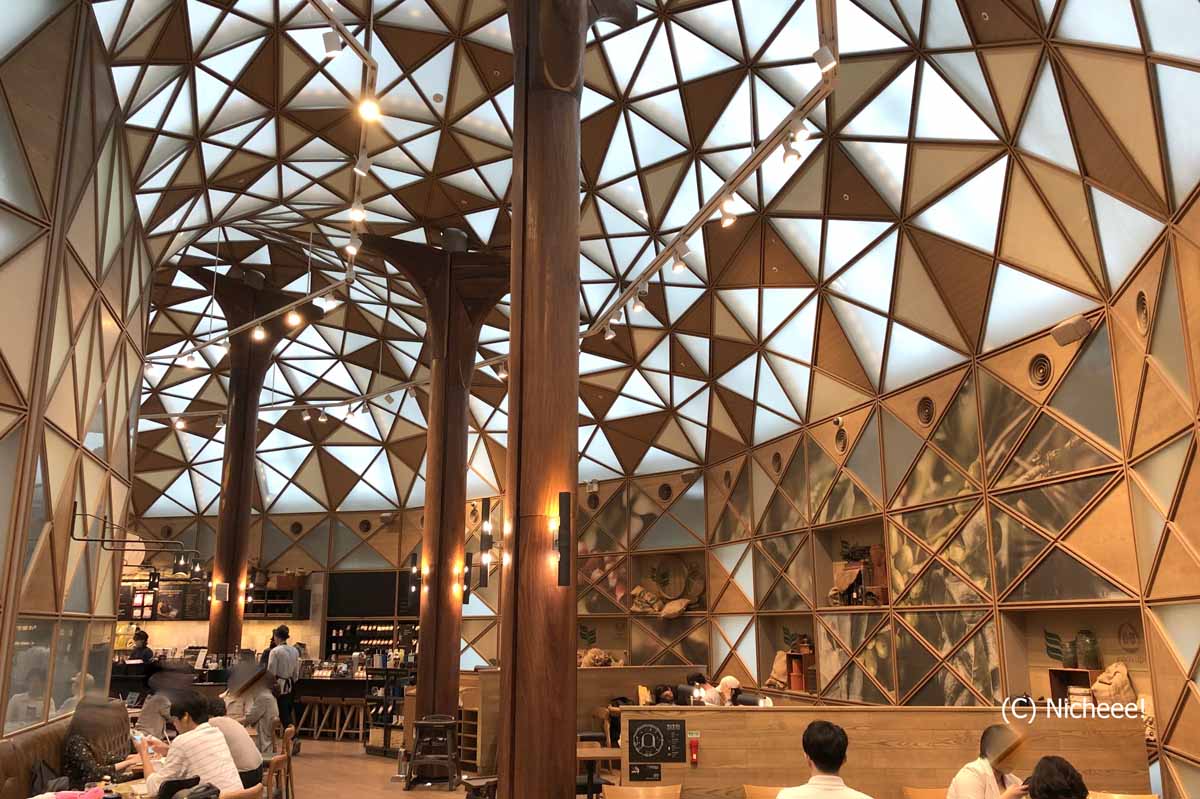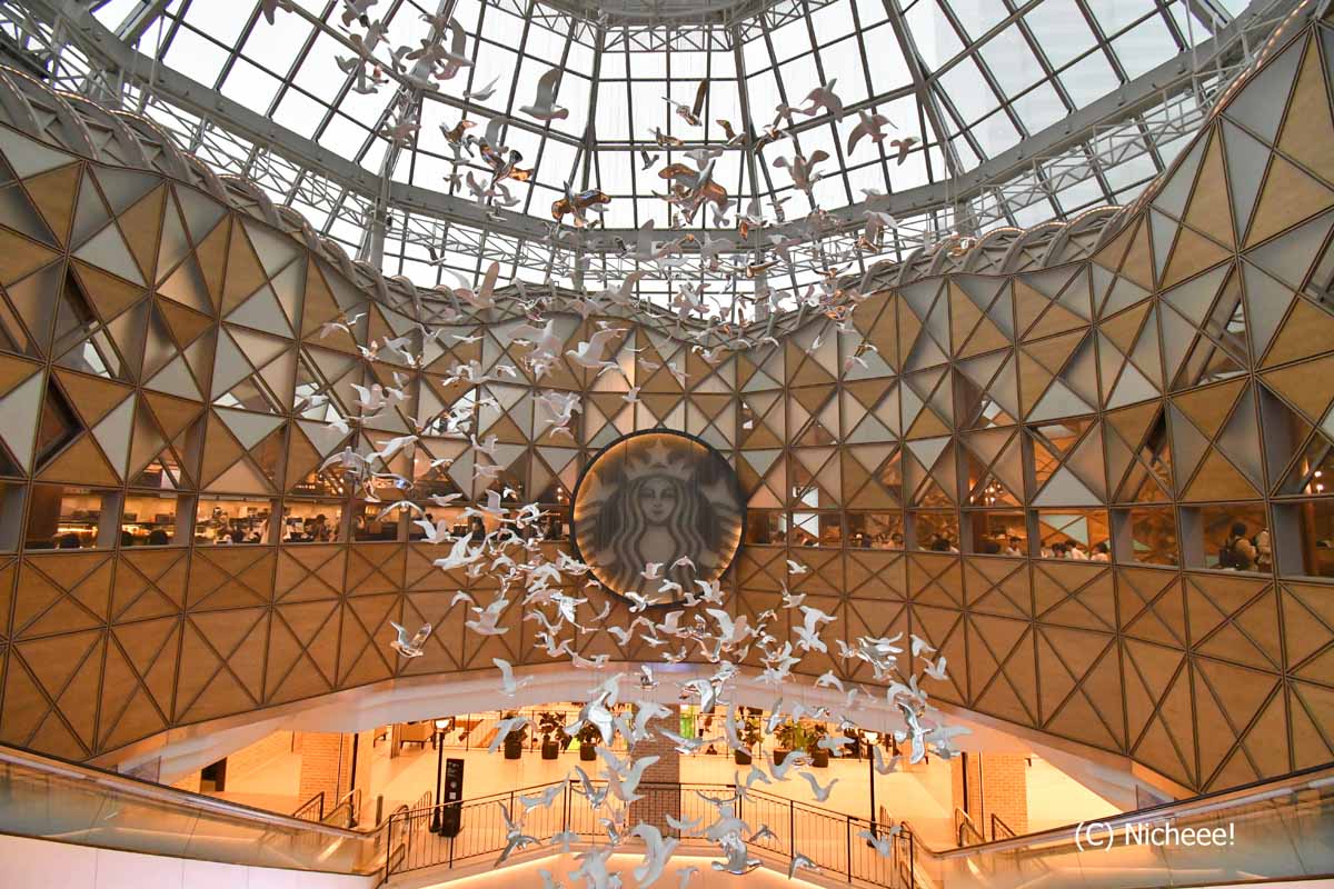 スターバックスの大きなロゴが掲げられ、白い鳥が舞う様子はとても豪華。店内に入ると、これまたおしゃれで、プレミアム店舗というこだわりが見られます。スターバックス・リザーブを併設。たくさんの椅子があるものの、さすが人気店舗なのでいつでも混雑しています。
