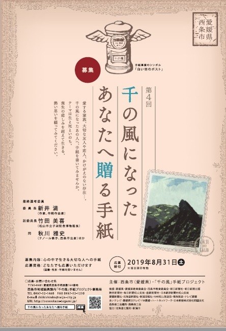 愛媛県東部の西条市で、誰もが知る名曲「千の風になって」にちなみ、亡き大切な人への想いをつづる手紙を全国募集しています。国籍、性別、年齢を問わず、誰でも応募できます。