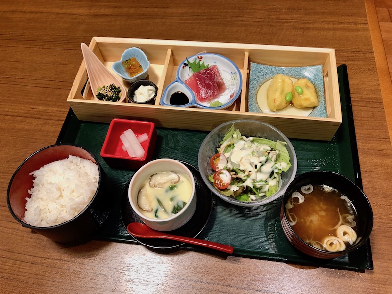 季節の三連箱・茶碗蒸し・サラダなどがセットになった「すこやか膳」(991円/税別)。白米は十六穀米に変更することも可。あっさりした味わいで女性におすすめだ。