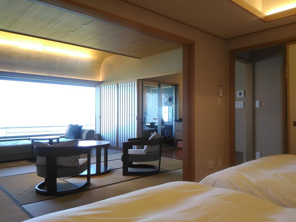 絶景海温泉の最高傑作ともいえるインフィニティー温泉“ぷーろ”ですが、それに加えて露天風呂付きや半露天風呂付き、檜風呂付き、和モダンなど、それぞれコンセプトが異なった客室も魅力的。しかも、すべての客室は海側に位置しており、壁面いっぱいにとられた窓から太平洋を望むことができます。