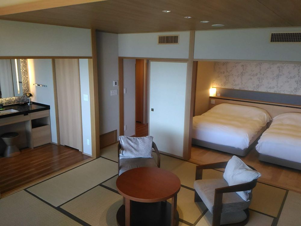 リニューアル客室のひとつである、半露天風呂付き和洋室は広さが58平方メートルもあり、半露天風呂では温泉も楽しめる贅沢さ。窓を開け放てば、ほぼ露天風呂状態で楽しめるので、誰にも邪魔されないプライベート感たっぷりのひとときを。窓際にはベッドソファーが配され、板張り・石・畳という3種類の床が、客室に彩りと心地好いアクセントを与えています。