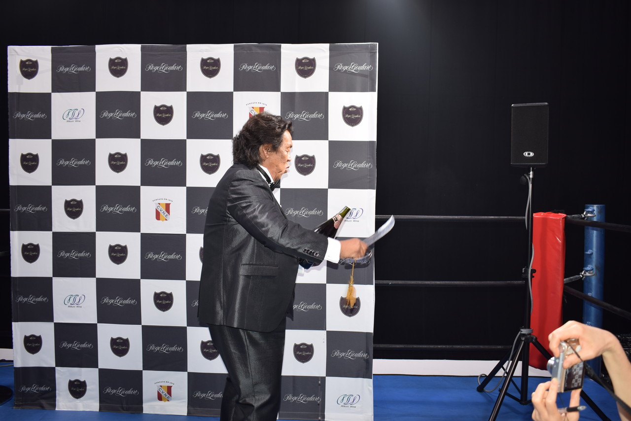 長州力はまずはじめに、シャンパンサーベルでワインの抜栓に挑戦。「シュポンッ!」という小気味よい音とともに綺麗に泡が噴き出し、見事なサーベル捌きで場内を沸かせた。