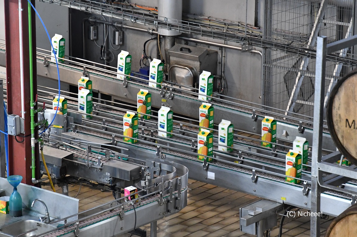 「ROTUI」の工場見学も、オープンしていれば可能です。見学無料。作業場の上から、製造風景が見られました。ちょうど「ROTUI」のジュースが製造されていたところで、パックされたジュースが流れていました。
