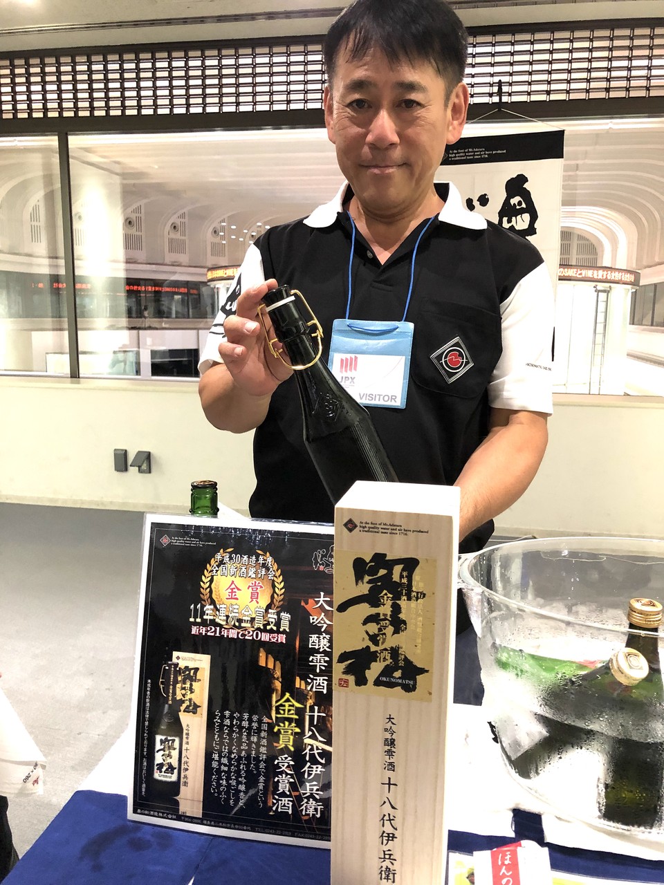 東京証券取引所と言えば、株式銘柄がぐるぐる回る電光掲示板「チェッカー」が名物。テレビの経済番組でよく見かけるあの光景が、目の前に広がっているだけでもドキドキ。しかも当日は特別に全国の蔵元やワイナリーなど40弱の出展者の名前が、なんと株の「銘柄」のようにあの電光掲示板に表示されてぐるぐる回っていたのです!参加された一般客も蔵元も、みんなでスマホで記念撮影。かなり盛り上がりました。運気が開けそうな“一粒万倍日”に、商売繁盛をみんなで願ったイベントとなりました。