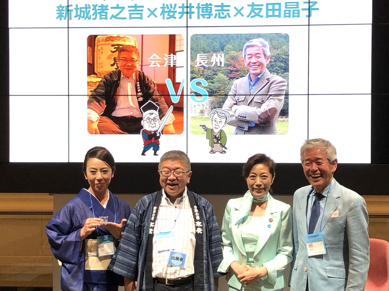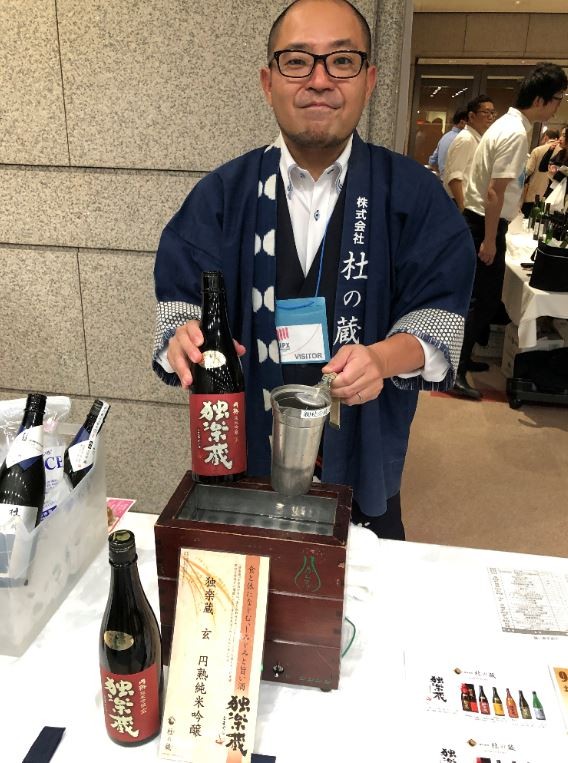 上の写真右は 渡會(わたらい)本店(山形県) の社長で、杜氏でもある渡會俊仁さん。山形は初めて県単位で地理的表示保証制度「GI」(Geographical Indication)の指定を受けた県。これは地域の優れた産品に対し、国が保証する制度で、渡會さんの名刺にも「GI YAMAGATA」のロゴマーク印がありました!渡會さんが両手に持っている日本酒は洋食に合うように作られたもの。日本酒をワインの樽に入れてねかせているので、香りがどこかワインっぽくもあり、確かに洋食にぴったりという感じでした。これは購入したい!