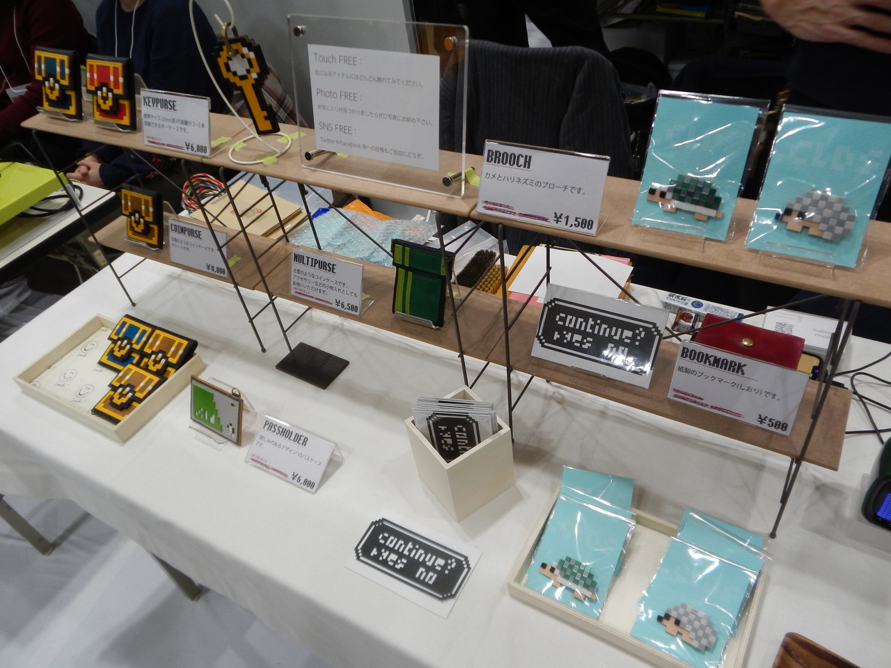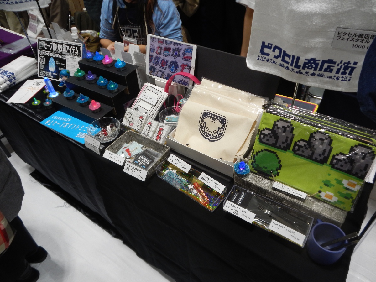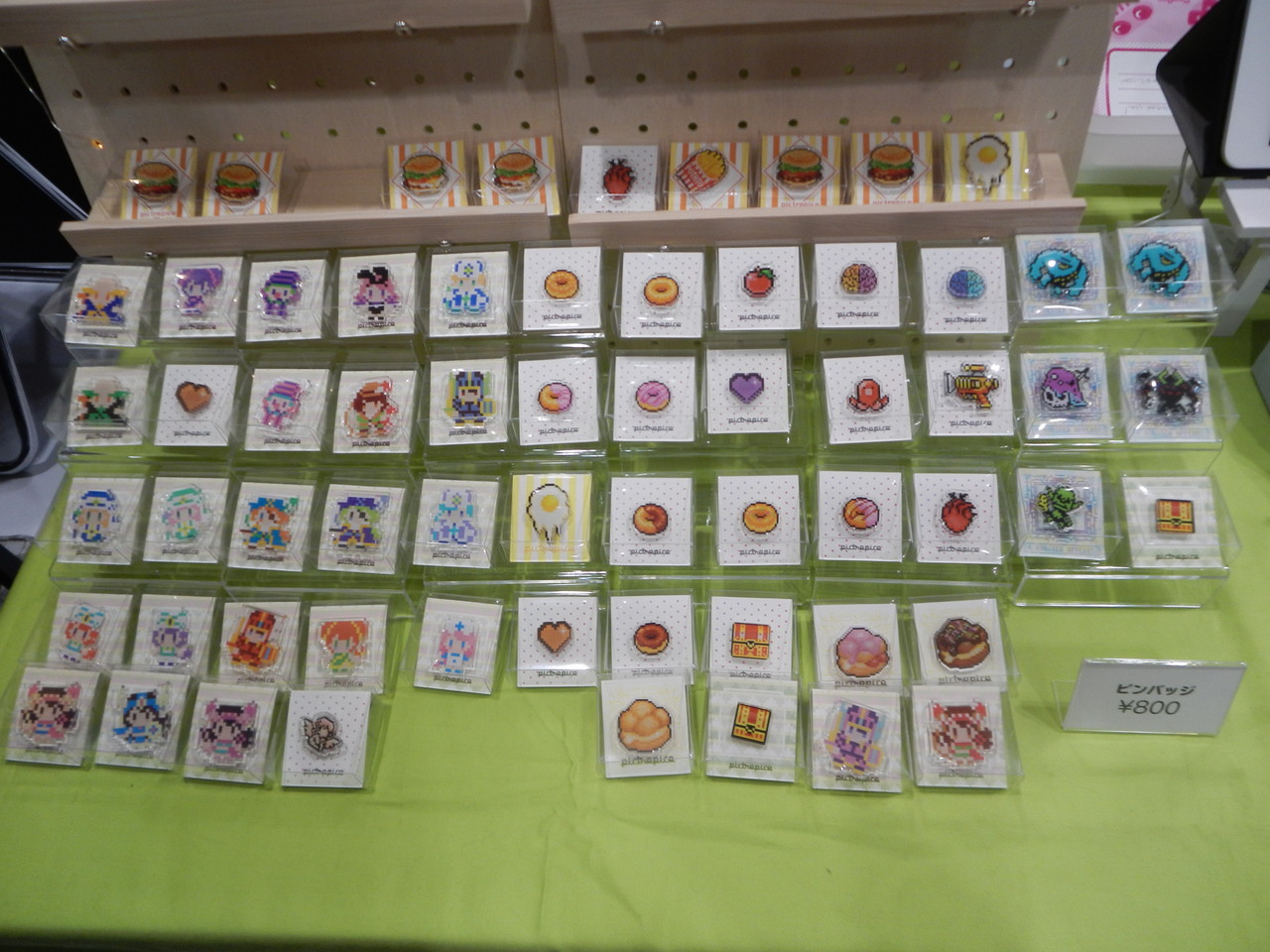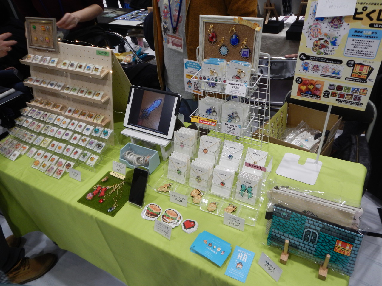 消しゴムはんこでピクセルアートの世界を表現する「京楽堂」。今回は消しはんグッズ頒布の他に、作品制作で実際に使われた消しはんや、コラボ作品も展示していた。