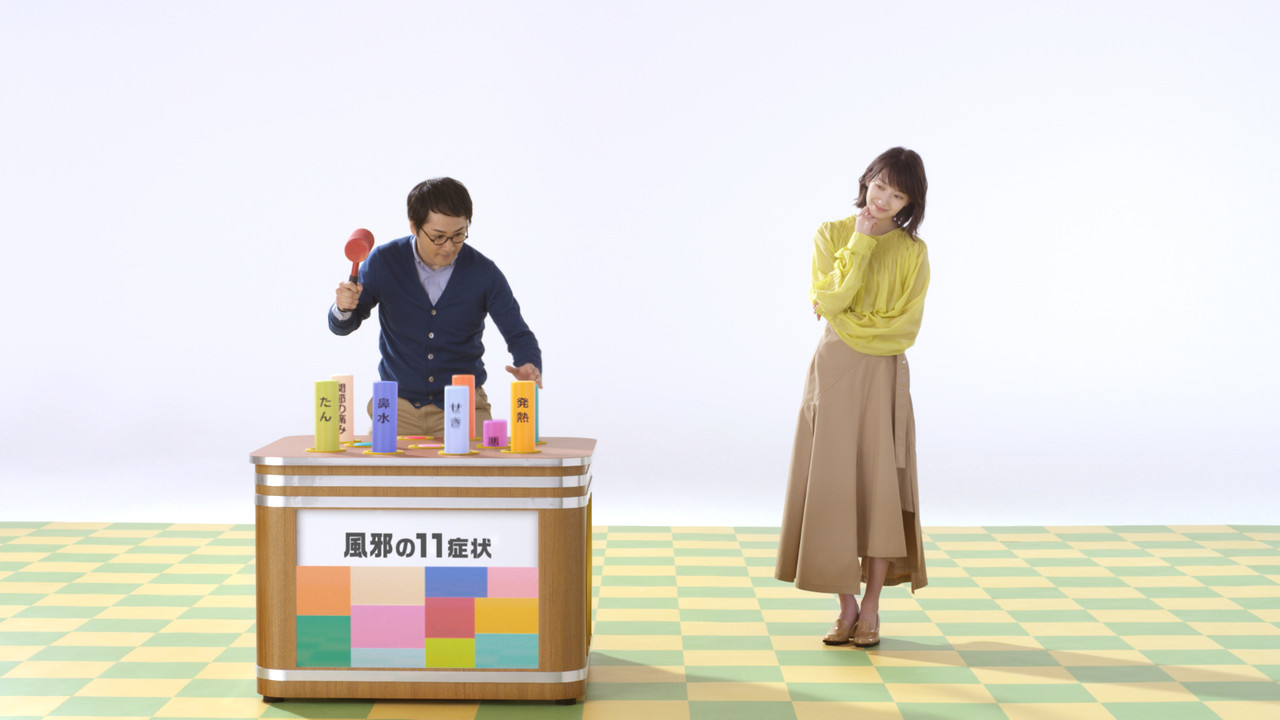 CMの世界観は、レトロなアーケードゲーム。風邪の11症状を記したポールが、モグラ叩きのように次々と飛び出す中で、懸命にハンマーを振る男性を横目に、波瑠が巨大なハンマーを勢いよく振り下ろし、風邪の症状達をまとめて叩くストーリーになっている。