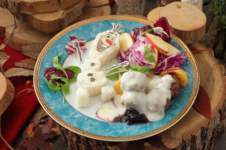 メニューでは例えば、アナの大好物であるサンドイッチと温かいトマトスープがセットの「<アナ>欲張りサンドイッチ&トマトスーププレート」、元気いっぱいなオラフが見られる「<オラフ>楽しいころころミートボールプレート」のほか、みんな大集合の「<アナと雪の女王2>ほっこりチーズケーキミルクティー」など。