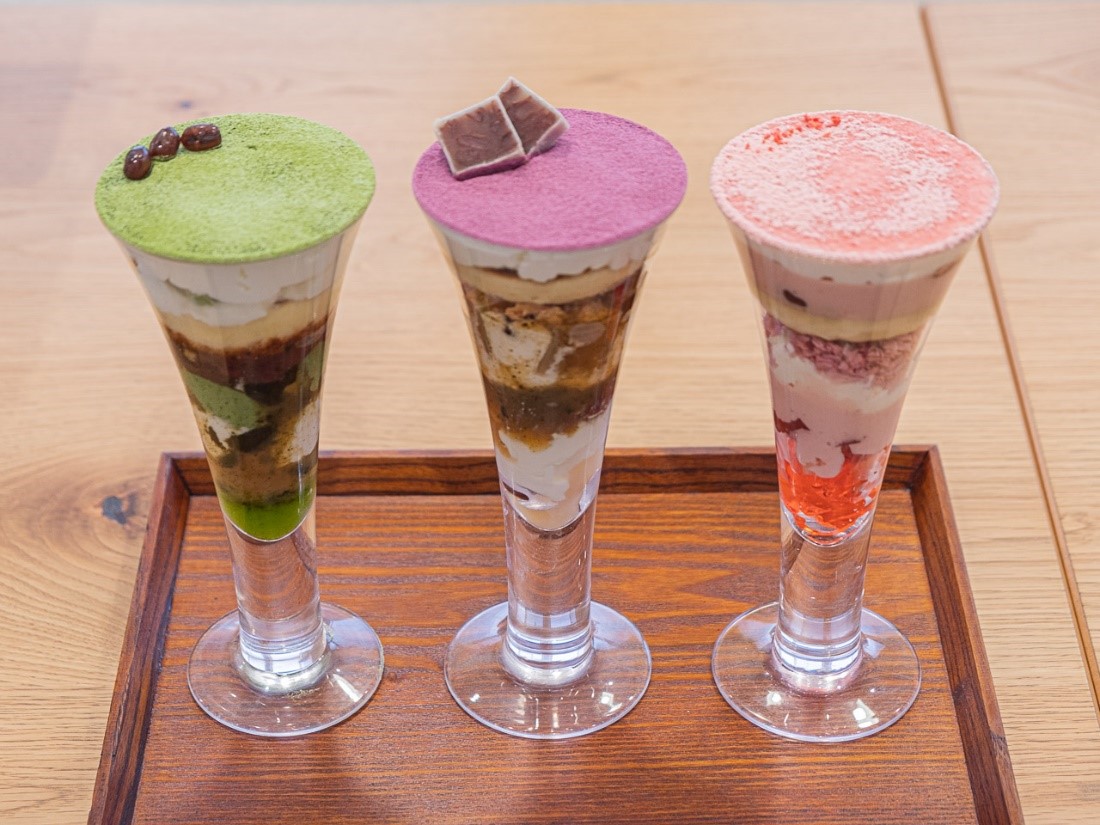 又一庵のパフェ(各800円税込み)は、粒あんや白玉、フルーツゼリー、生クリームが層になっている特製パフェ。左から抹茶(13層)、あんこ(13層)、イチゴ(14層)の全三種類です。色どりも華やかで、いろいろな味が次々と飛び出してきてびっくりさせられます。