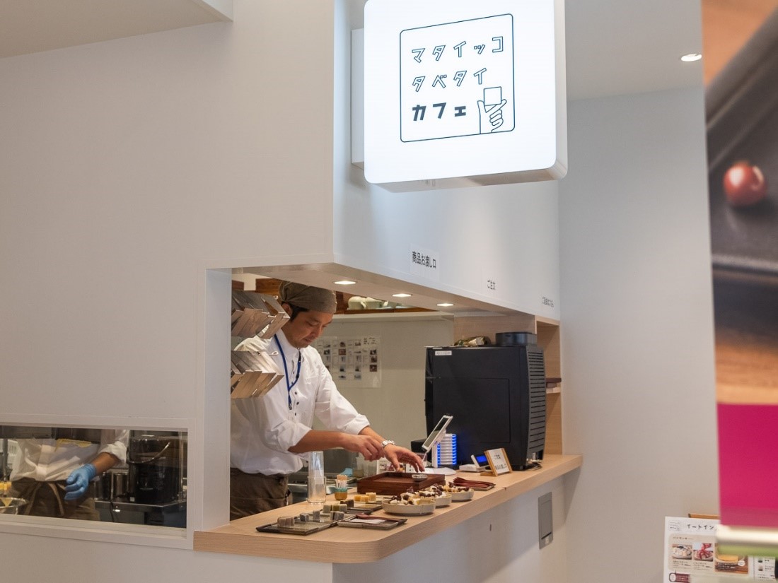あんこを炊くいい香りが漂う中、暖簾をくぐってすぐ右側にあるのが「マタイッコ タベタイカフェ」のテイクアウトコーナーです。きんつばに使ってきた北海道十勝産の小豆のあんこをフィーチャーした、「和スイーツ」をテイクアウトできます。表にベンチもあるので、日向ぼっこをしながら食べるのもよさそう。