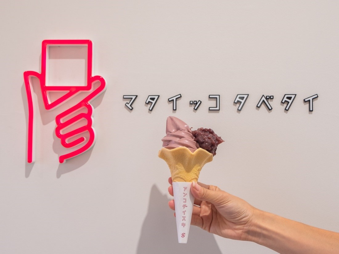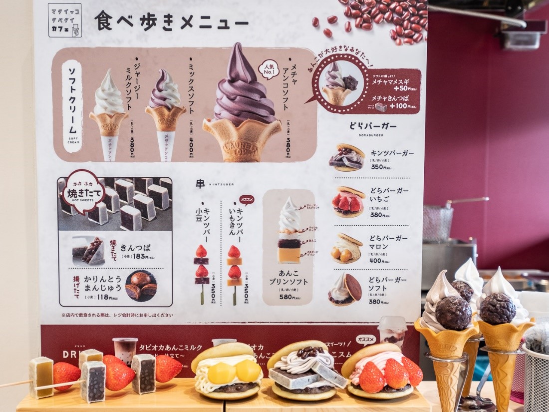 「メチャアンコソフト」(380円税込み)に、どら焼きの皮にきんつばを挟んだ「キンツバーガー」(350円税込み)、イチゴとキンツバを串に刺した「小豆キンツバ―」(350円税込み)など、これまでの和菓子のイメージを覆す商品が並びます。