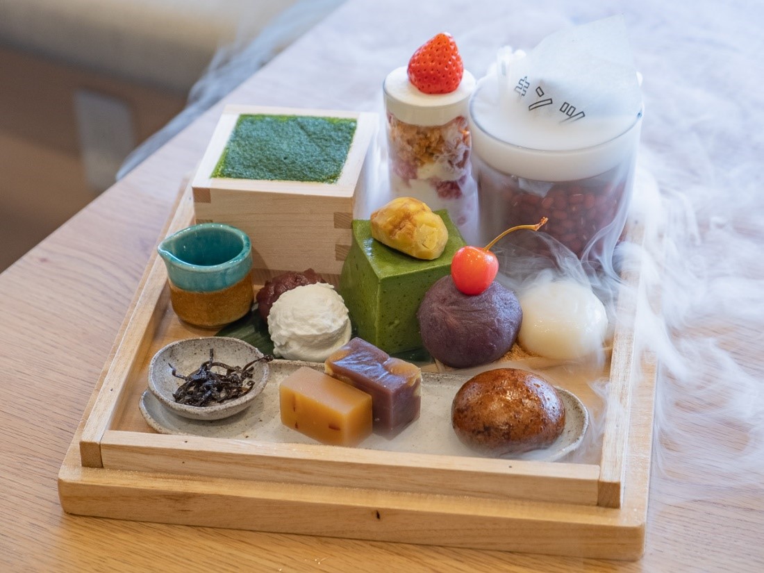 こちら「キンツバコ」(3000円税込み)です。かりんとうまんじゅう、季節の栗蒸し羊羹、芋羊羹、塩昆布、抹茶の葛切り、つぶあん、こしあん、クリームチーズ、白玉と黒みつ、抹茶のティラミスは枡の中に、さらにイチゴのパフェに、迫力のドライアイスの上に乗っているのは冷たいきんつば。これに抹茶がつきます。
