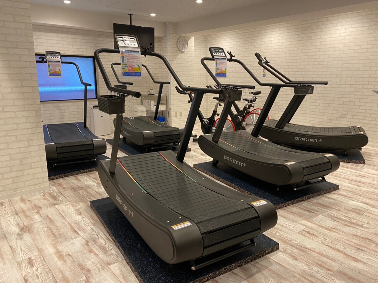 有酸素運動……ということで、こちらの自走式のランニングマシンで20分間歩いたり走ったりします。人生初のランニングマシンにドキドキです。