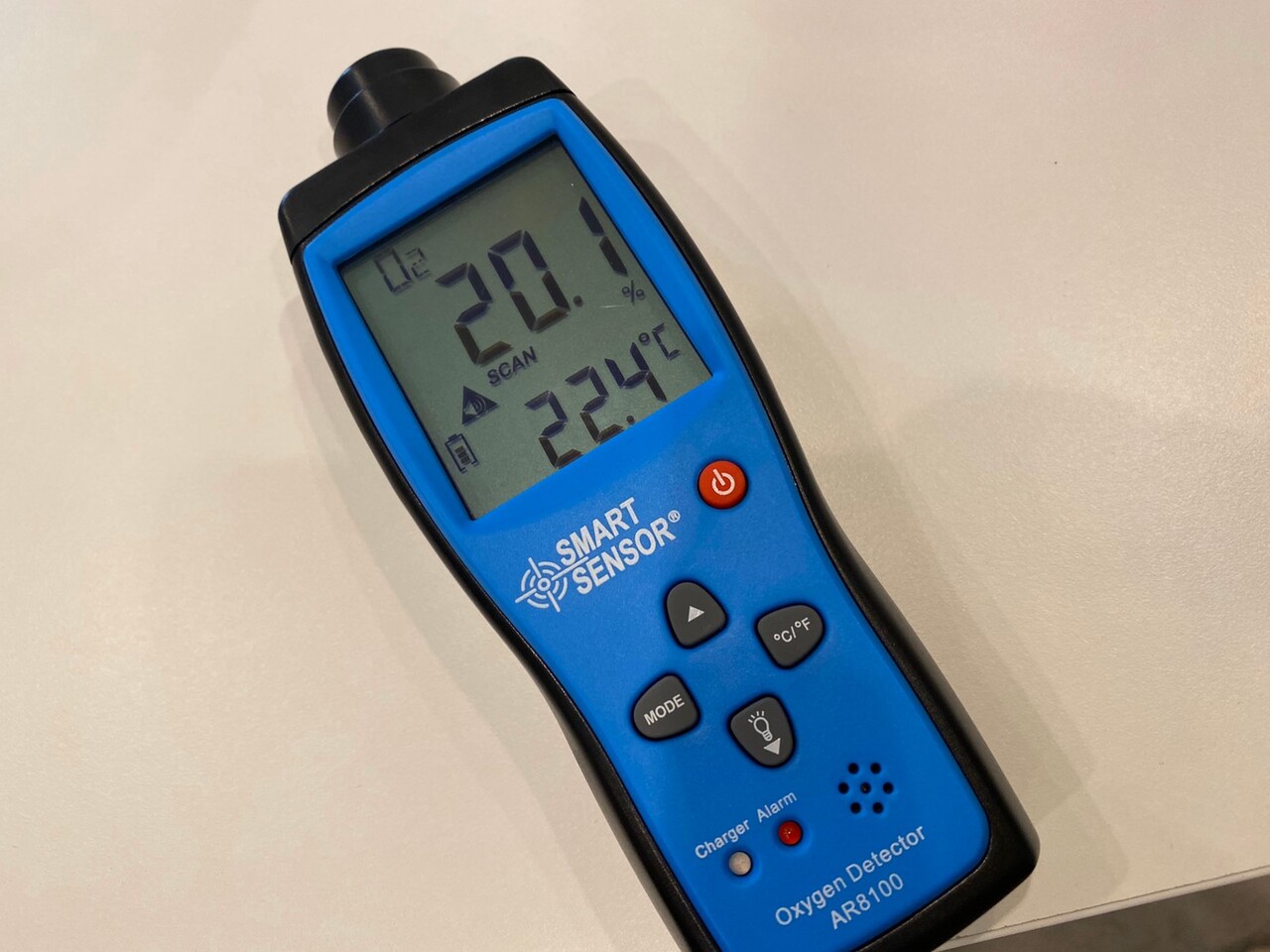 空気中の酸素濃度を計るこちらの機械で見てみると、トレーニングルームの外は20.1%でしたが……