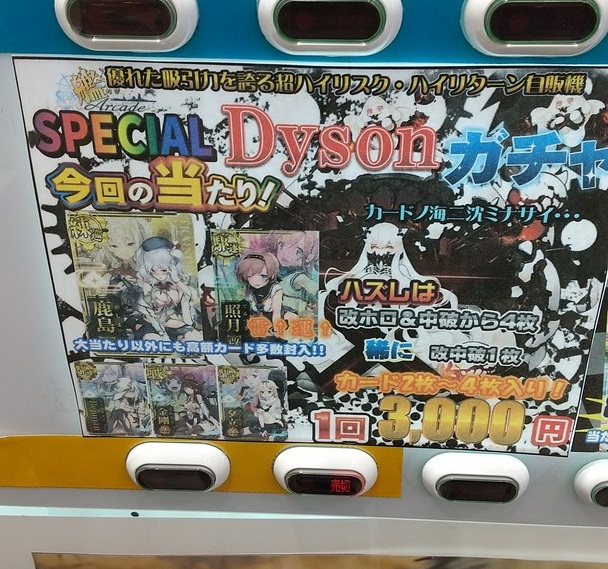 東京は秋葉原、ラジオ会館1階、入ってすぐ横にある「カードラボ秋葉原ラジオ会館店」さんで見つけた艦これアーケードのガチャ「SPECIAL Dyson ガチャ」1回3000円。