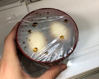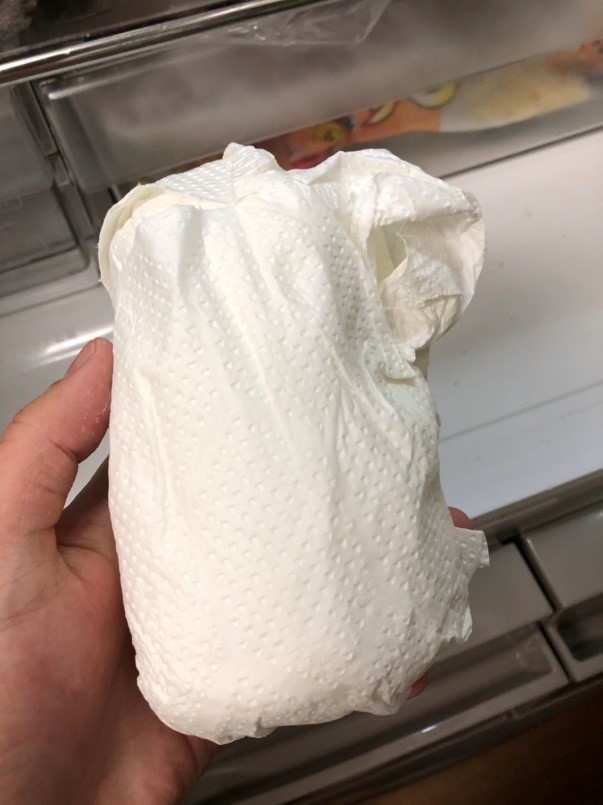 何ともコメントに困る画像ですが、コチラはベーコンです。奮発して大きめの物を購入してきました。ネットで調べてみると、「燻製をする際に材料に水分があると薫りがつきにくく、酸味が出てしまう可能性がある」との注意書きを見つけたので、そのページにあったようにクッキングペーパーでグルグル巻きにして、冷蔵庫に寝かしてみました(水分をしっかりと吸うため、2回ほどクッキングペーパーを変えています)。