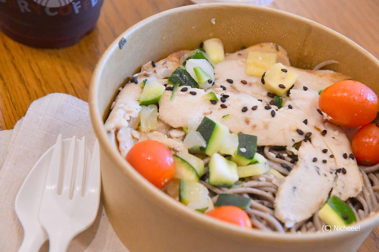 蕎麦の上に、ローストチキンと胡麻、そしてきゅうりとトマトなどがのっていました。ドレッシングはスパイシー味噌や胡麻などから選べます。