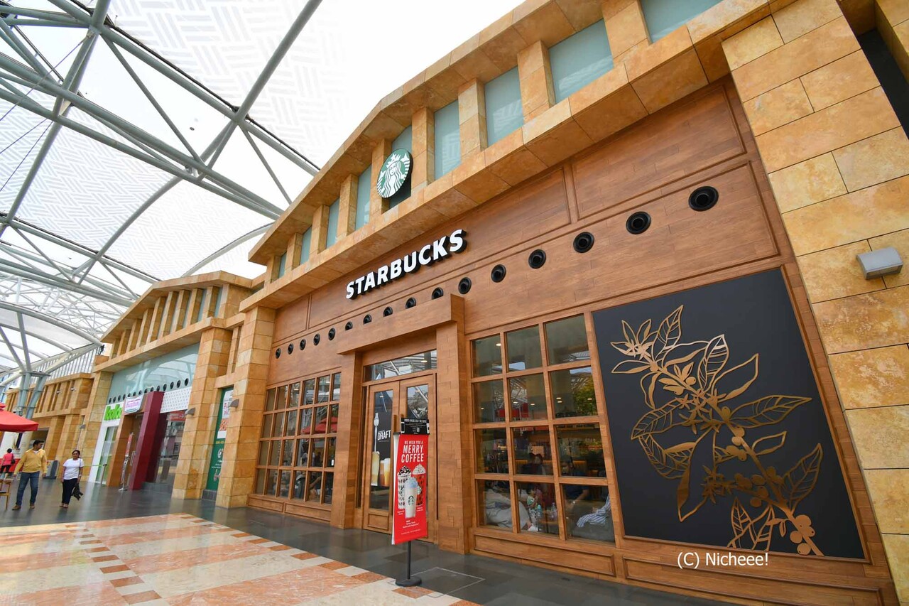 いろいろな店舗が並ぶ一角のあるスターバックスは、外観が「木」を基調にしていて、なかなかおしゃれ。遠くから見えてもわかりやすい店構えです。