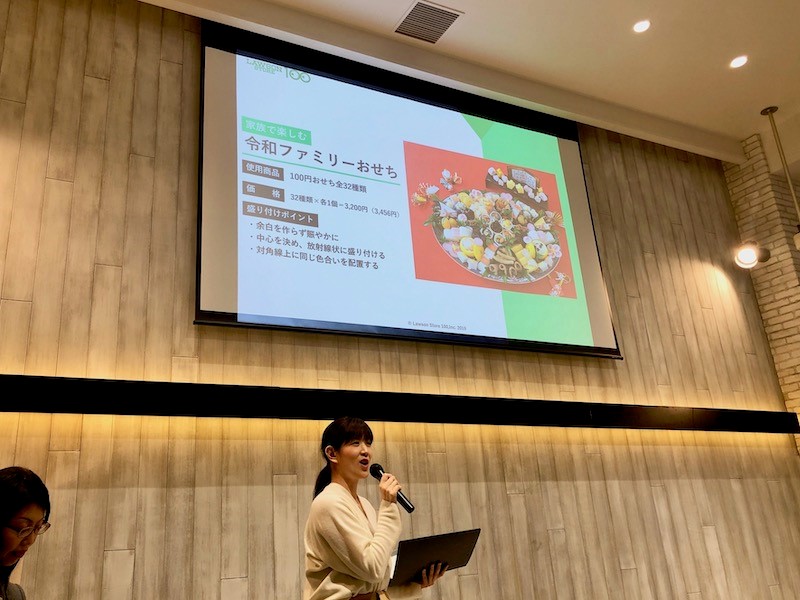 続いて料理研究家・インスタグラマーの小林睦美さんが登壇。「100円おせち」を自由に楽しむ盛り付けが提案された。「新商品のお煮しめは家庭で作ったようなほっとする味わい。大人から子供まで幅広い年齢の人にオススメですよ」と話した。