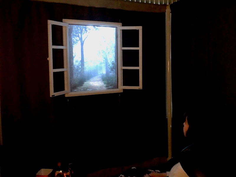 スクリーンには森林が徐々に暗くなって行く映像が数分間上映。監修した林教授によると、睡眠前は副交感神経の活動を優位にすることが必要とのこと。ストーリー性が強くない、自然をモチーフにした連続性のある映像を見ることでリラックスしやすくなるという。