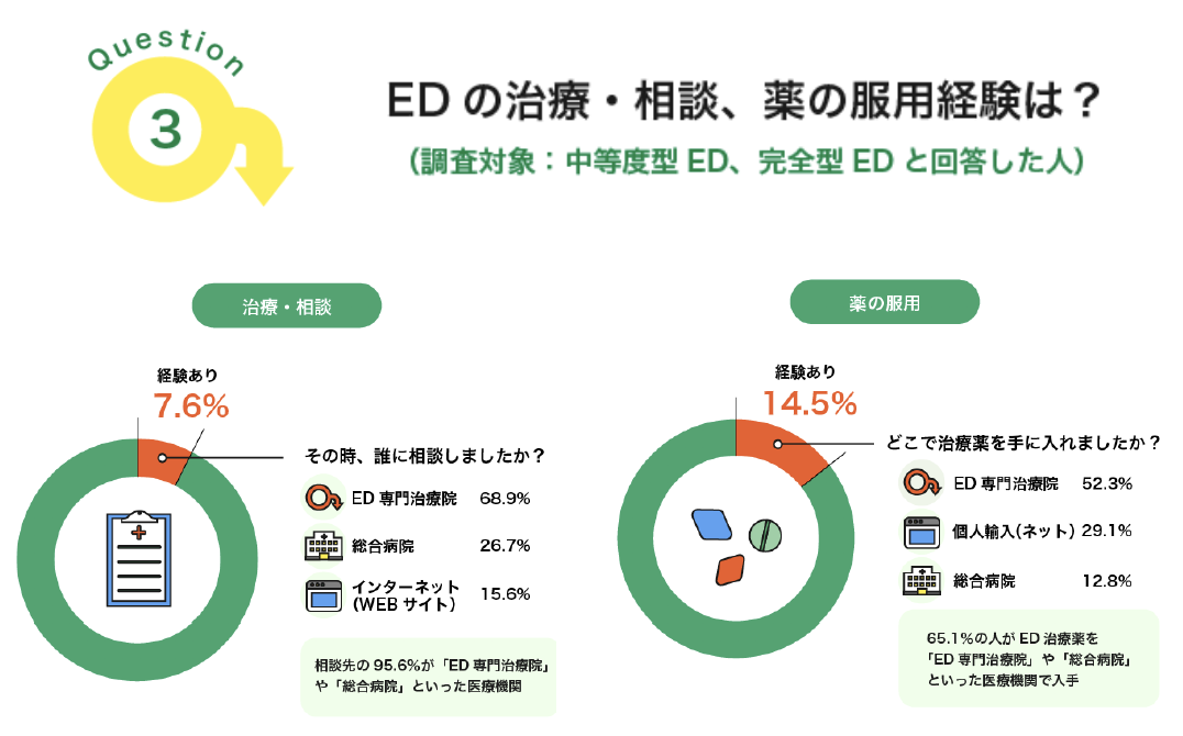 これらの結果のように、現代日本ではかなり多くの人がEDについて深刻に悩んでいることがわかりました。EDは年齢に関わらず多くの人にとっての問題であり、非常に繊細な問題であるがゆえに、医療機関に足を運ばない方も多いようです。しかし、自己診断で薬を服用することでは問題の根本的な解決にはなりにくく、それこそがED患者の増加につながっているとも言えるでしょう。