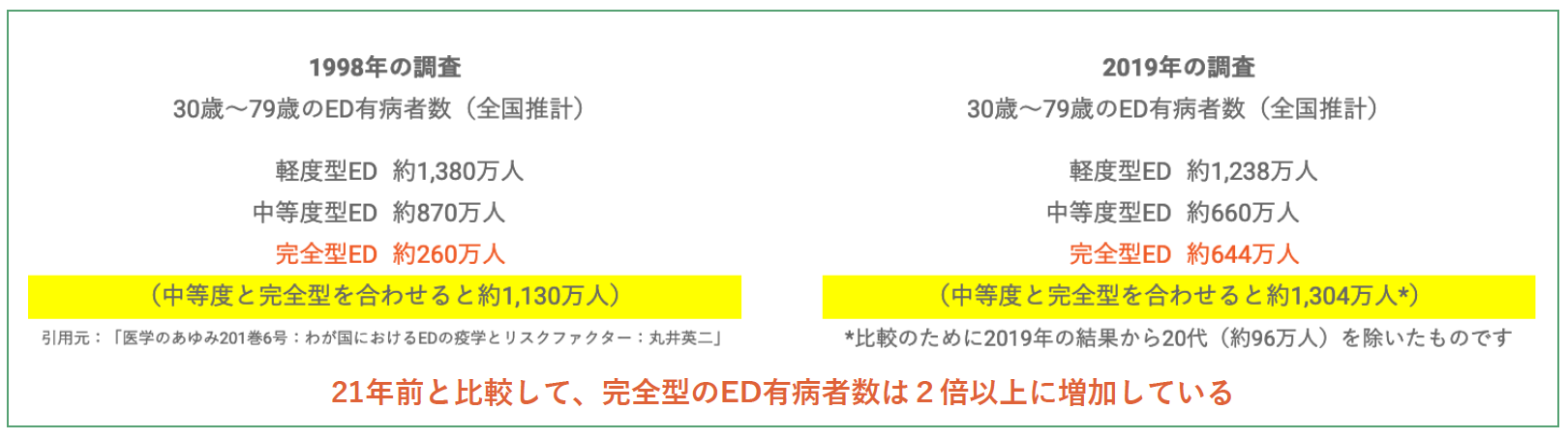 これは以前に調査のあった1998年と今回の2019年の調査を比較した図です。軽度型EDと中等度型EDの割合は減っているものの、完全型EDは倍以上に増えていることが伺えます。中等度型以上に注目してみると、1998年の調査では約1130万人なのに対して、2019年の調査ではED有病者が約174万人も増加しており、その数は約1304万人にのぼりました。