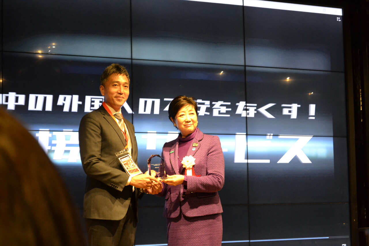 斬新なアイデアながら、どれも「外国人」「高齢者」のそれぞれにとっての利便性向上につながるもののように感じられた。そんな中で、子育て中の外国人の不安をなくす!予防接種サービスが最優秀賞を受賞、小池百合子東京都知事より記念の盾が贈られた。