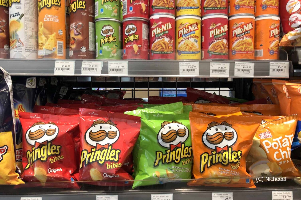 その他、お菓子などもフィリピンで売られているものばかりで、日本のローソンのオリジナルブランド商品などはなし。「プリングルス」の袋入りはなんだかこれも新鮮で、横にはカルビーのポテトチップスも。