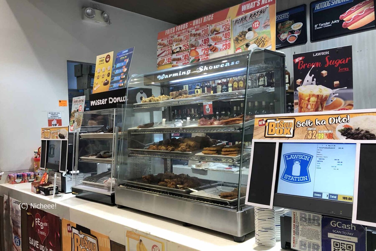 例えば、フードコーナー。日本だと「からあげくん」だったり焼き鳥だったりが売られているショーケースに入っているのは、フィリピンでおなじみのフライドチキンやホットドッグなど、チキンが多め。