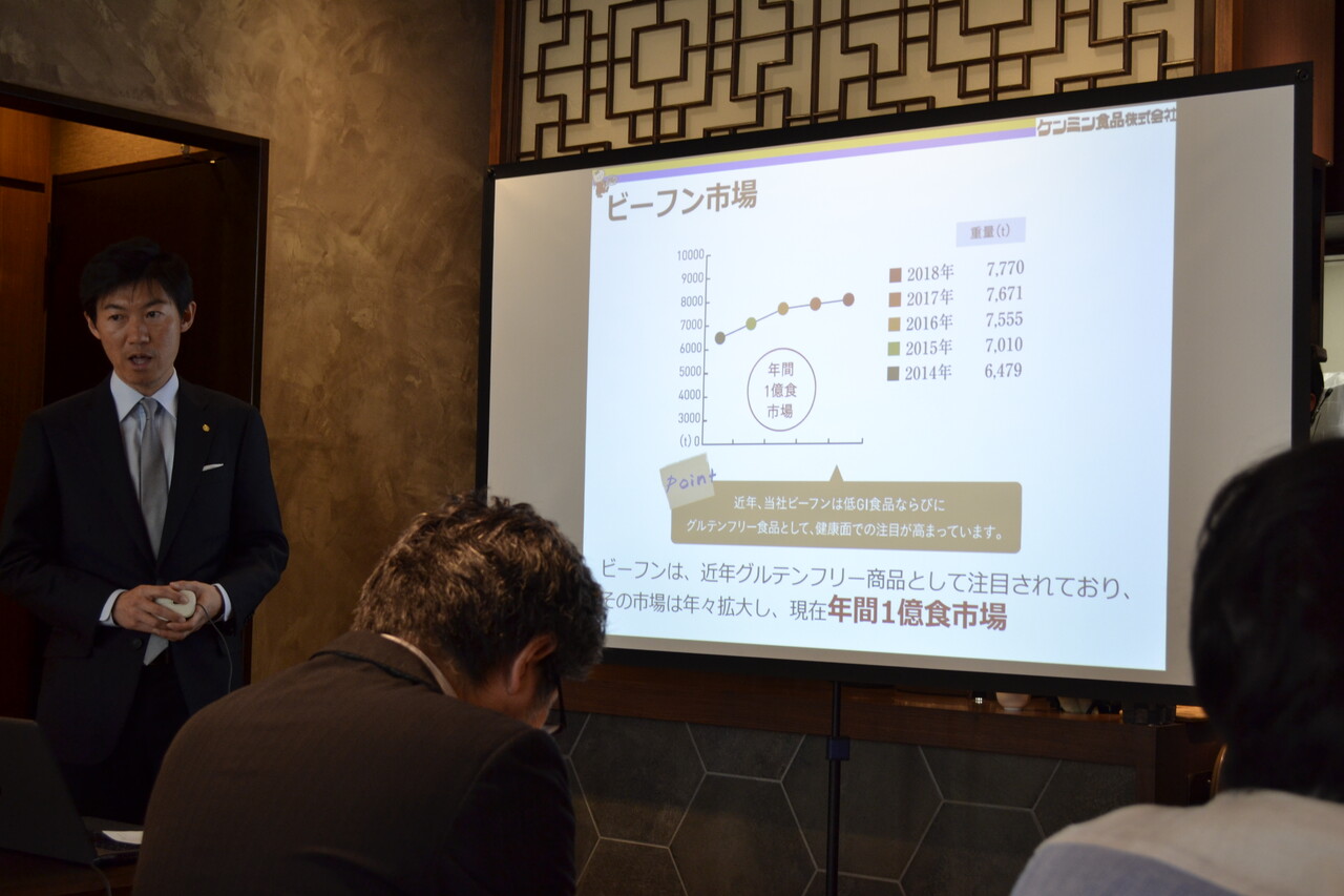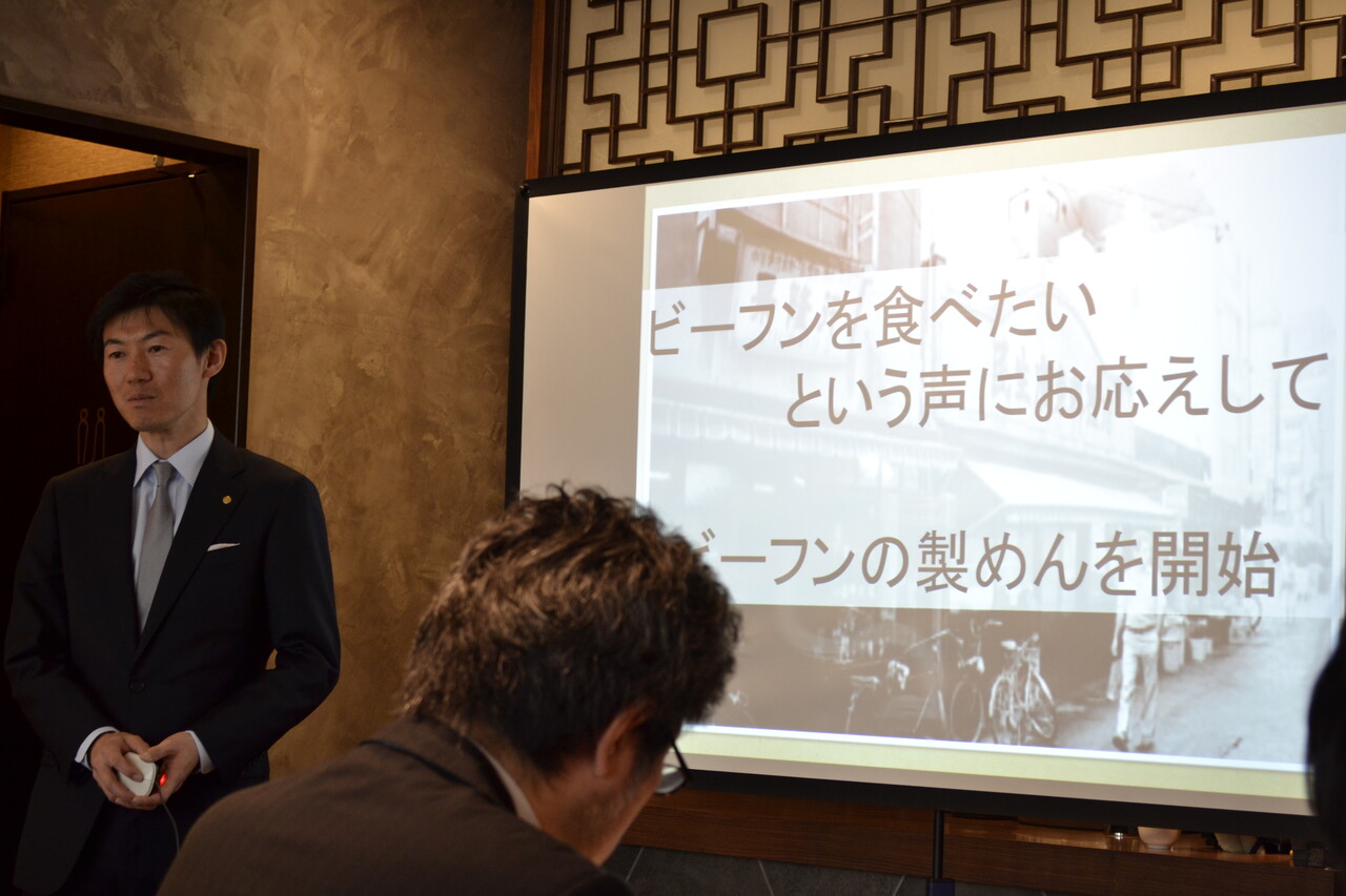 まずはじめに、創業者の孫で3代目社長の高村祐輝氏より、ケンミン食品の歴史や、昨今のビーフン市場の動きなどが語られた。