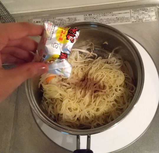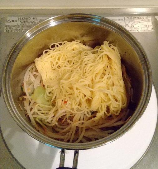 野菜から水分が出ると思うので、今回は水を入れません。ある程度麺をほぐしてから入れます。