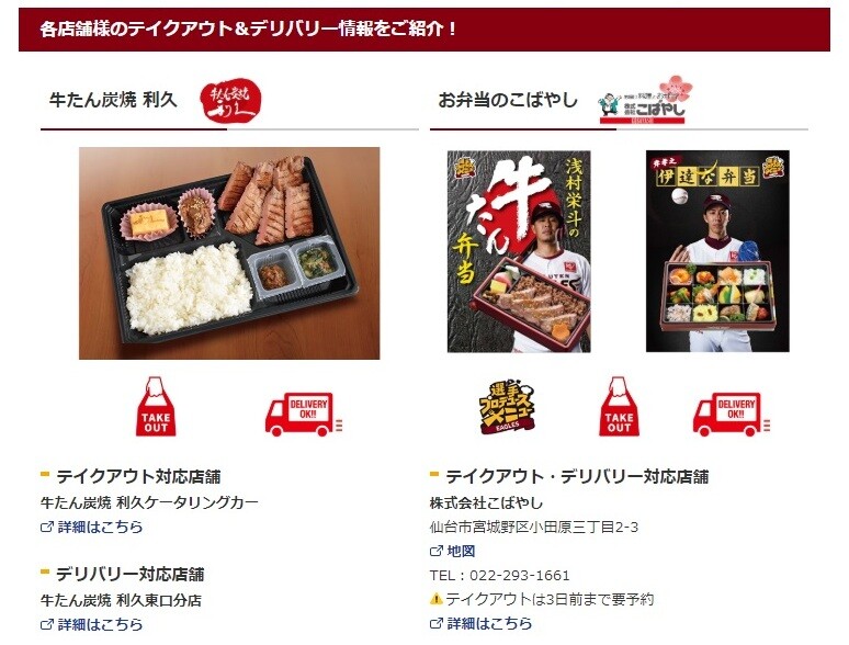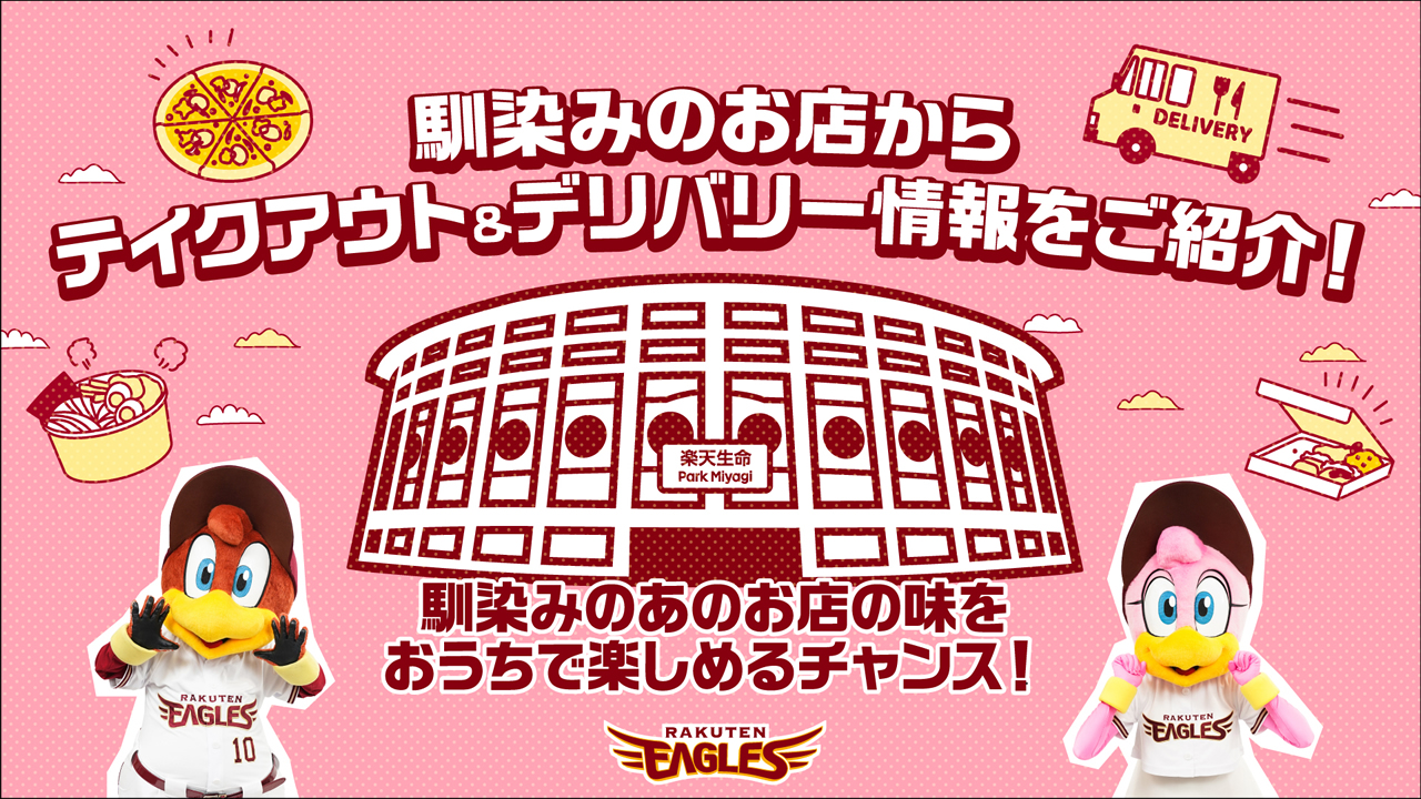 本拠地、楽天生命パーク宮城で販売している選手弁当などで、テイクアウトやデリバリーができる店舗を、公式サイト内で紹介。自宅やオフィスで球場グルメが楽しめる。個数制限、事前予約などが必須な商品もあり、要チェック。