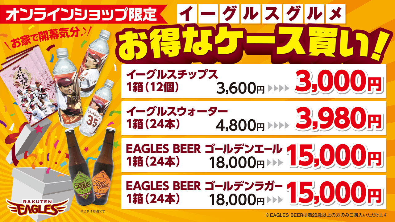 また、選手が商品パッケージに印刷されているファンの人気商品「イーグルチップス」や「イーグルウォーター」、ビールのお得なケース売りも。